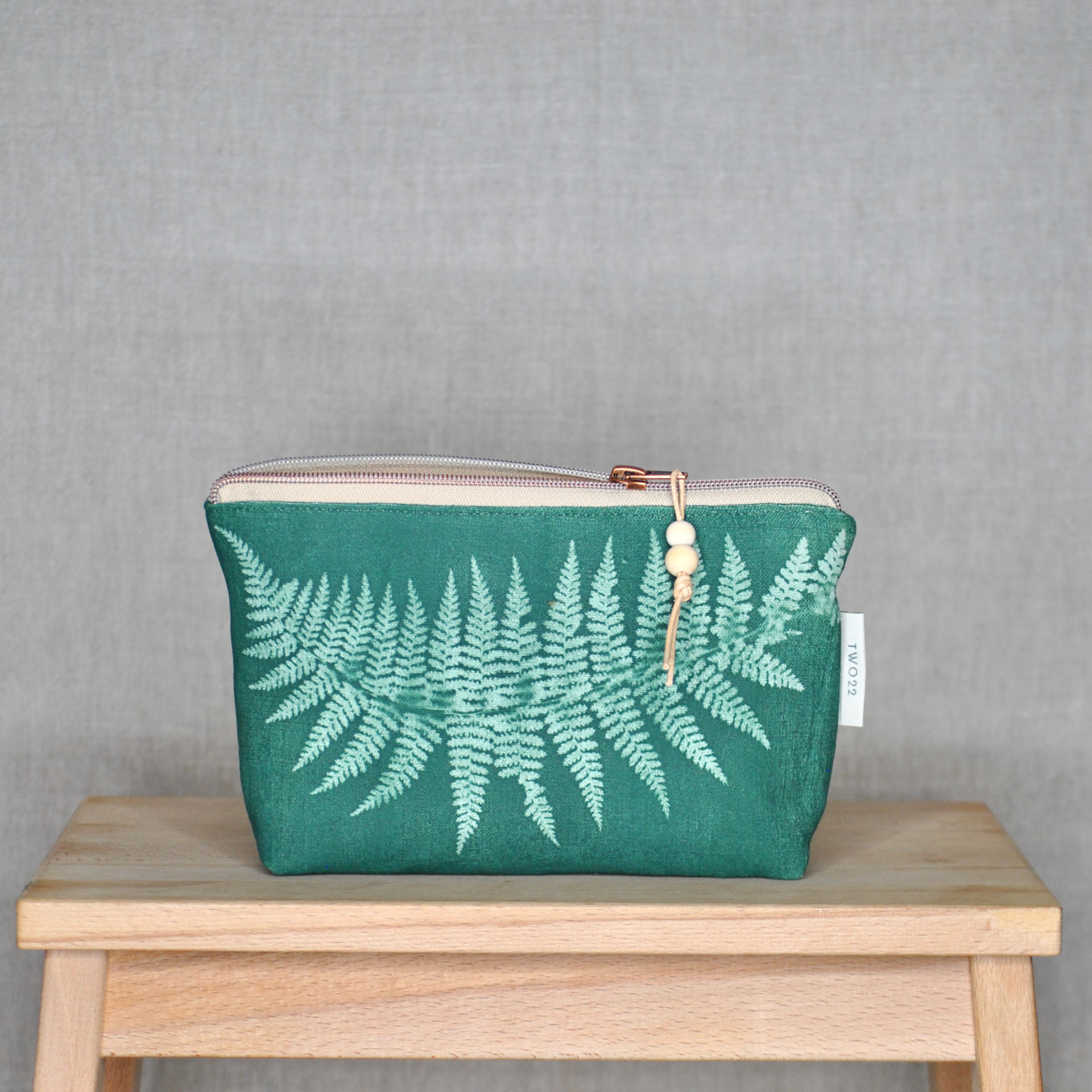 Einzigartig wie du – Handbedruckte Kosmetiktasche aus antikem Leinen mit natürlichem Farnprint