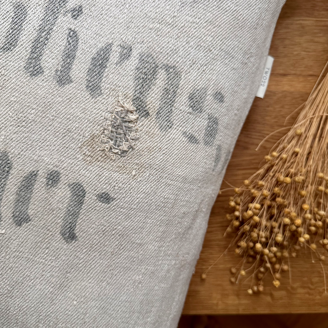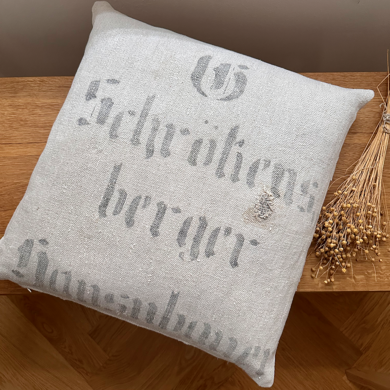 Das Sackleinen ist in sehr gutem Zustand mit schönem Originaldruck. Eine geflickte Stelle ist ein authentisches Zeichen der Zeit und unterstreicht den antiken Charakter des Materials. Sie macht das Kissen zu einem einzigartigen Unikat, das Geschichte sichtbar und fühlbar werden lässt.