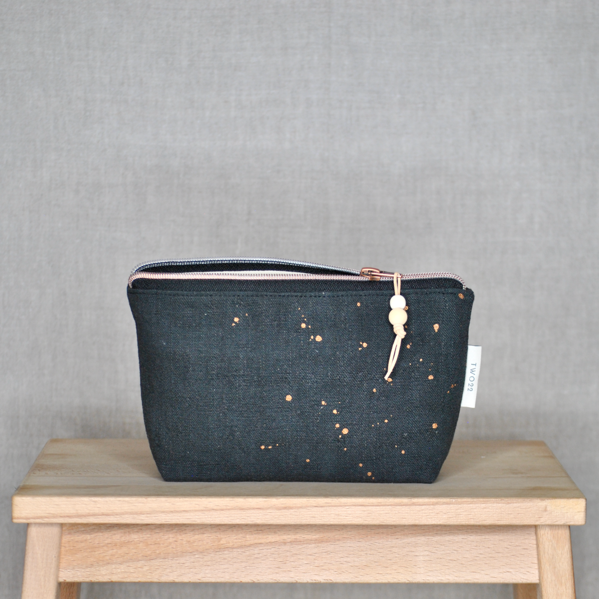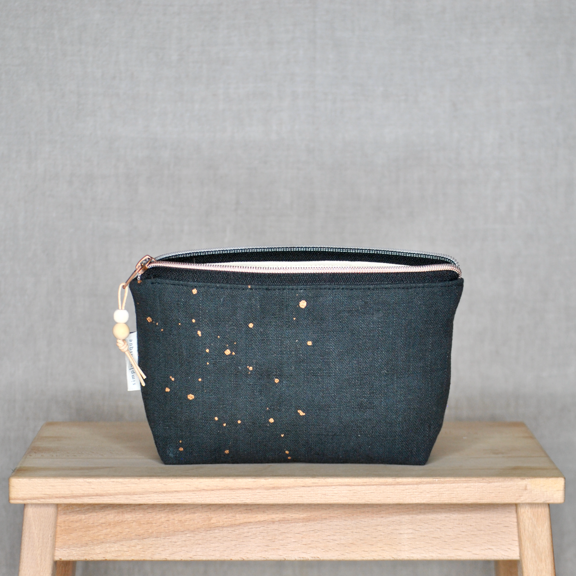 Handbedrucktes Tupfenmuster in schimmerndem Bronzeton auf schwarz gefärbtem Leinen. Mit seinem einzigartigen Print ist CELIA eine hübsche Geschenkidee zu Weihnachten und bringt die Augen der Beschenkten bestimmt zum Leuchten.