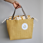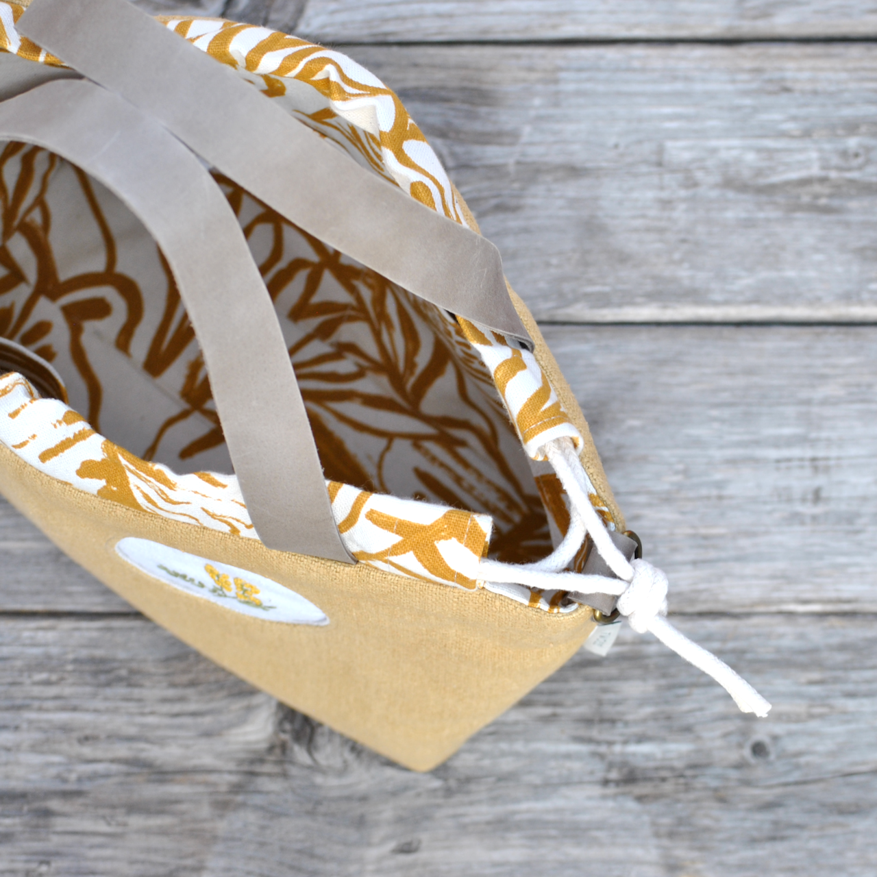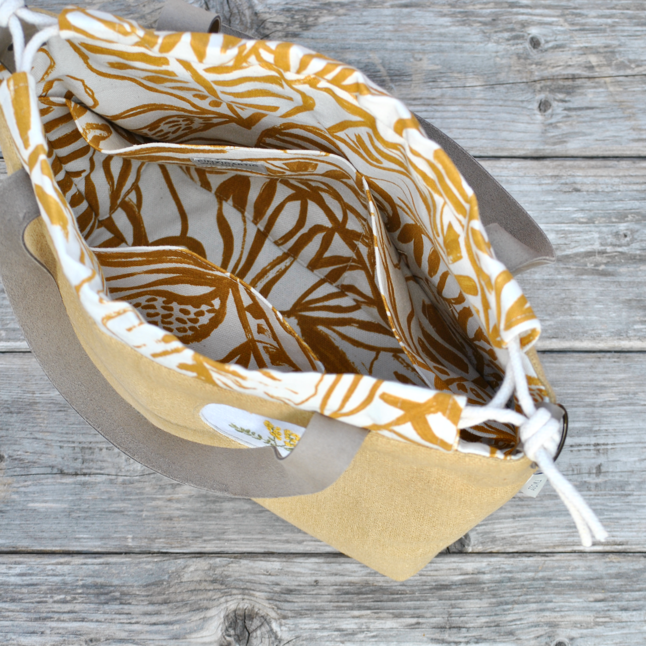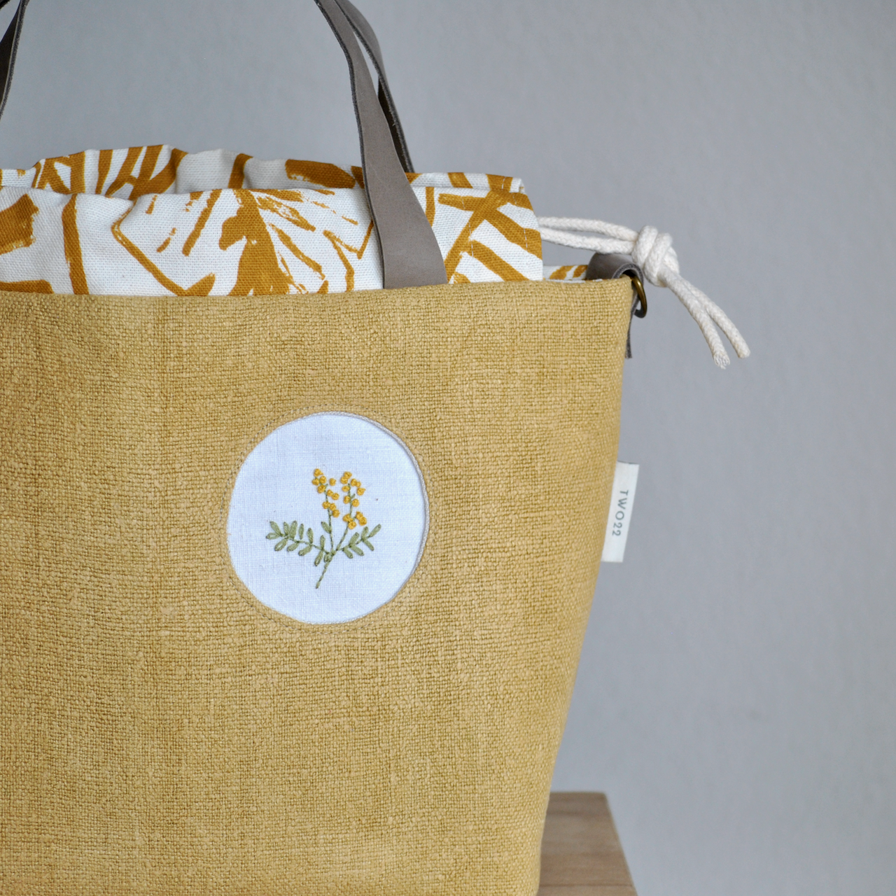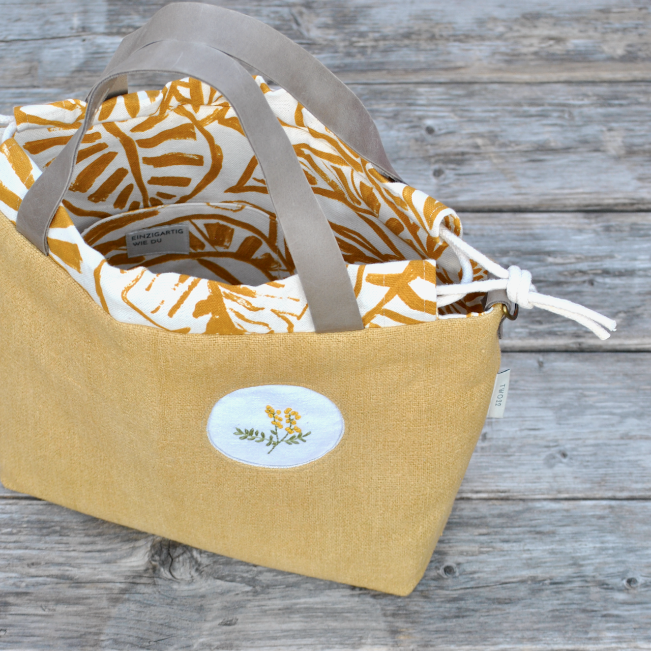 Projekttasche Senfgelb mit Stickmotiv Mimose