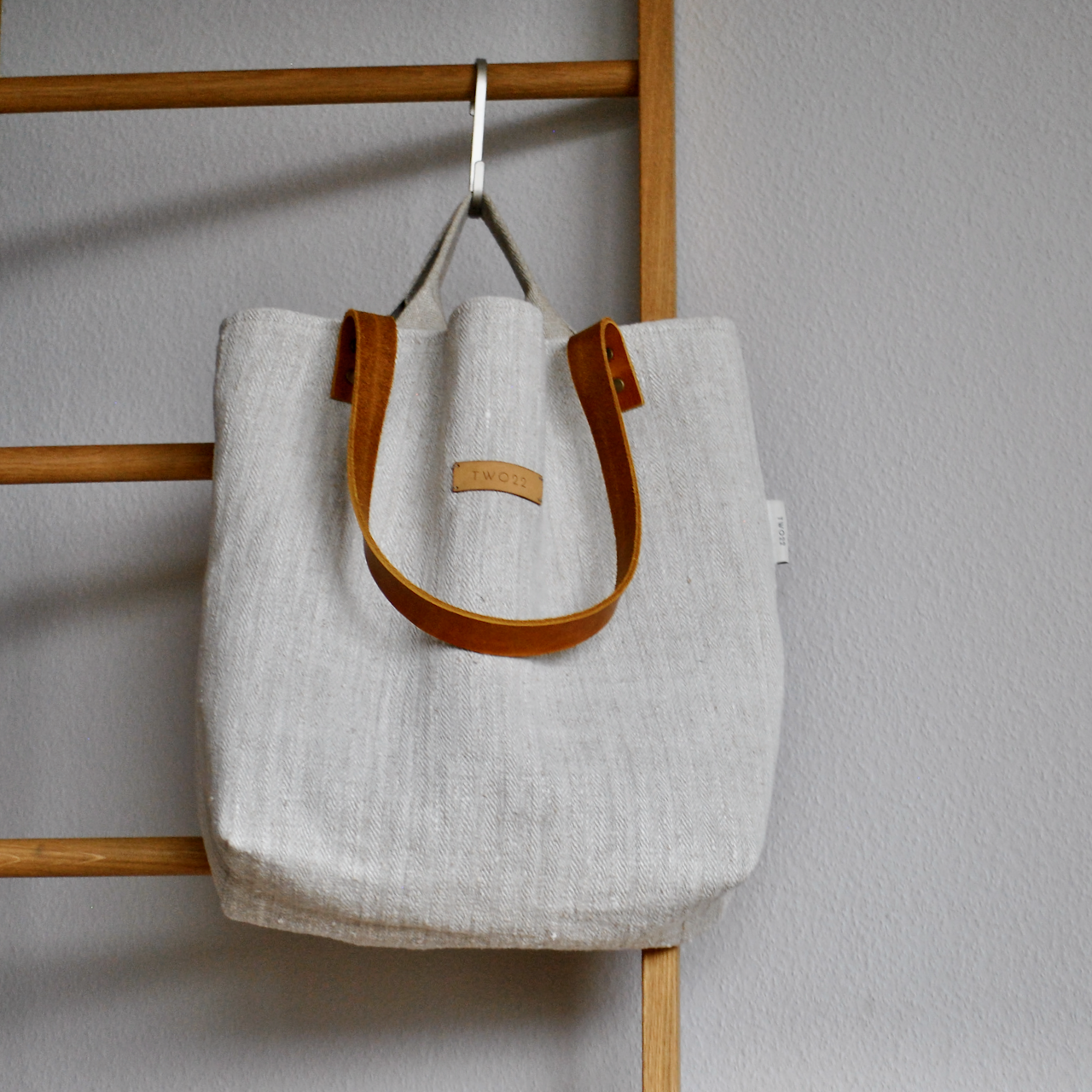 Das handgewebte Sackleinen dieser Tasche stammt aus einem Leinenballen, der über viele Jahrzehnte erhalten blieb. Dieses Material ist von robuster Qualität und zeichnet sich durch seine feste Webung mit einer schönen Fischgrätstruktur aus. Dennoch ist das Leinen sehr leicht und hat einen angenehm weichen Griff.