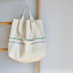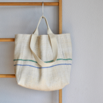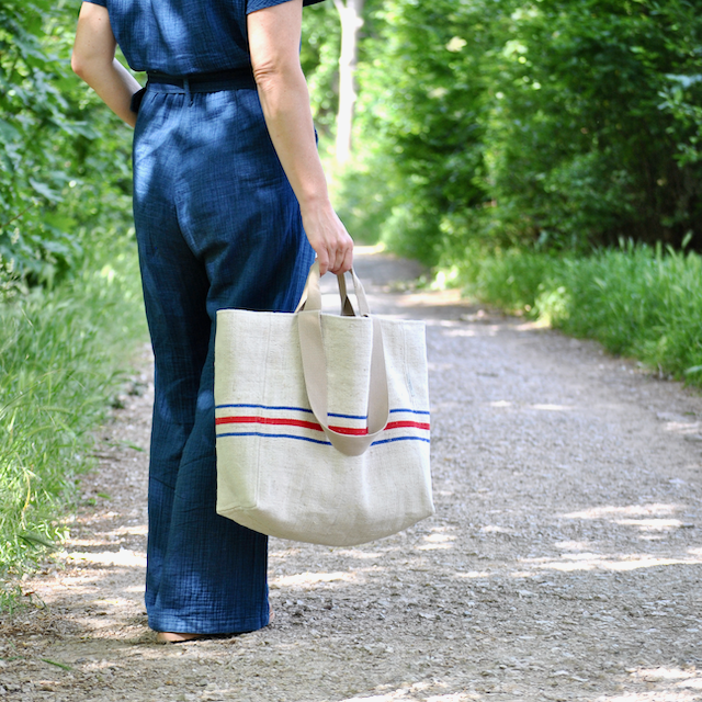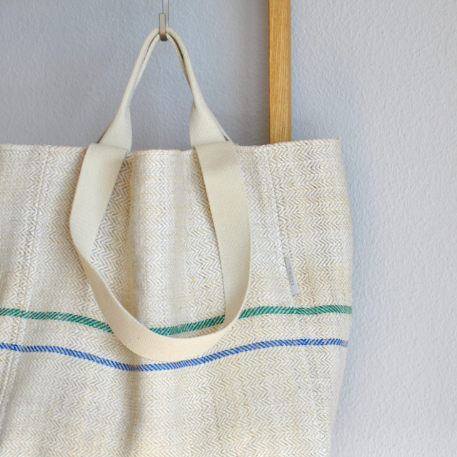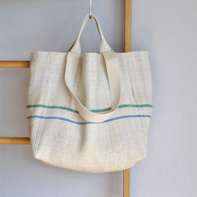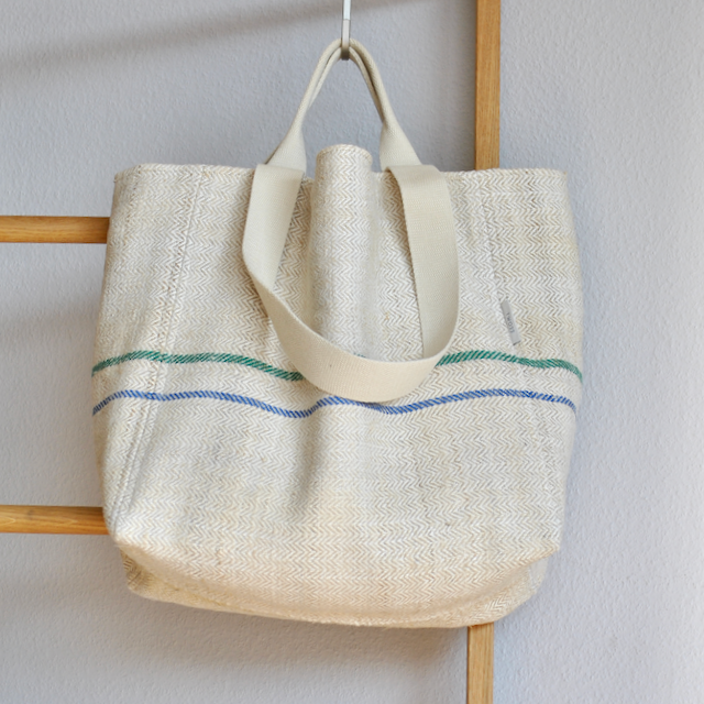 Das handgewebte Sackleinen dieser Tasche stammt aus einem alten, unbenutzten Leinenballen, der über viele Jahrzehnte erhalten blieb. Dieses Material ist von besonders hochwertiger Qualität und zeichnet sich durch seine feste Webung mit schöner Struktur und angenehmen Griff aus – das Material ist in dieser Qualität nur noch selten zu finden. Das charakteristische Streifenmuster erzählt die Geschichte einer Bauersfamilie. Jede Familie hatte ihr eigenes unverwechselbares Muster um ihr Getreide zu kennzeichnen.